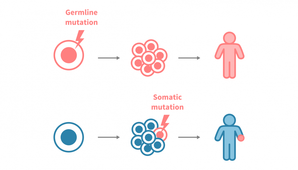 - Somatic mutations arise in non-germ cells (e.g. somatic) during life. These acquired alterations (such as TP53 loss in many tumors) are not inherited, will not pass to offspring, but can profoundly shape cancer development.
